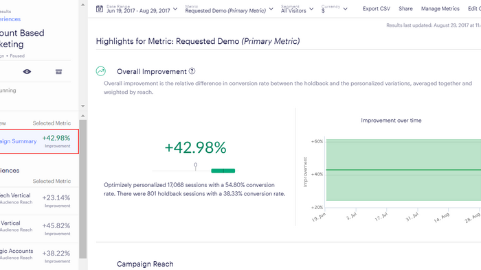 - Campaigns results page: Get a breakdown of each personalized experience to understand ROI.