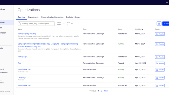 - Campaigns results page: Get a breakdown of each personalized experience to understand ROI.