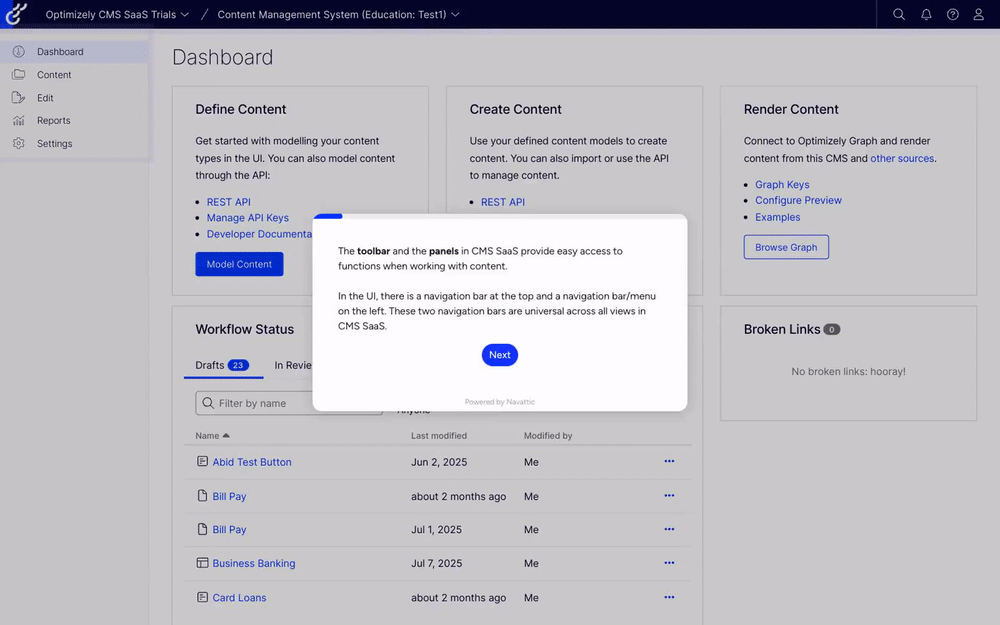 In this module, you’ll get familiar with the navigation panes in Optimizely CMS SaaS user interface, which bring together all the key tools and features within easy reach to simplify content management.