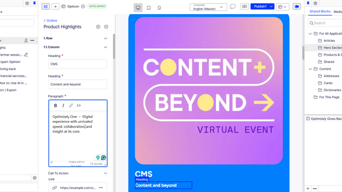 The Optimizely CMS SaaS Visual Builder is an intuitive editing interface designed to empower content creators, marketers and non-technical users to build and manage content with real-time previews without developer involvement.