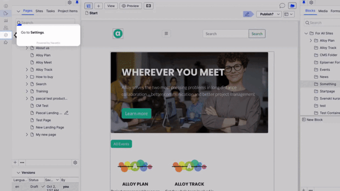 - Set rights for content types like pages, blocks, images, documents, or assets.
