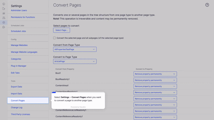 Convert pages feature which allows administrators and developers to change a page (and optionally its sub-pages) from one page type to another. Useful when content templates evolve and you need existing pages to use a new page model.