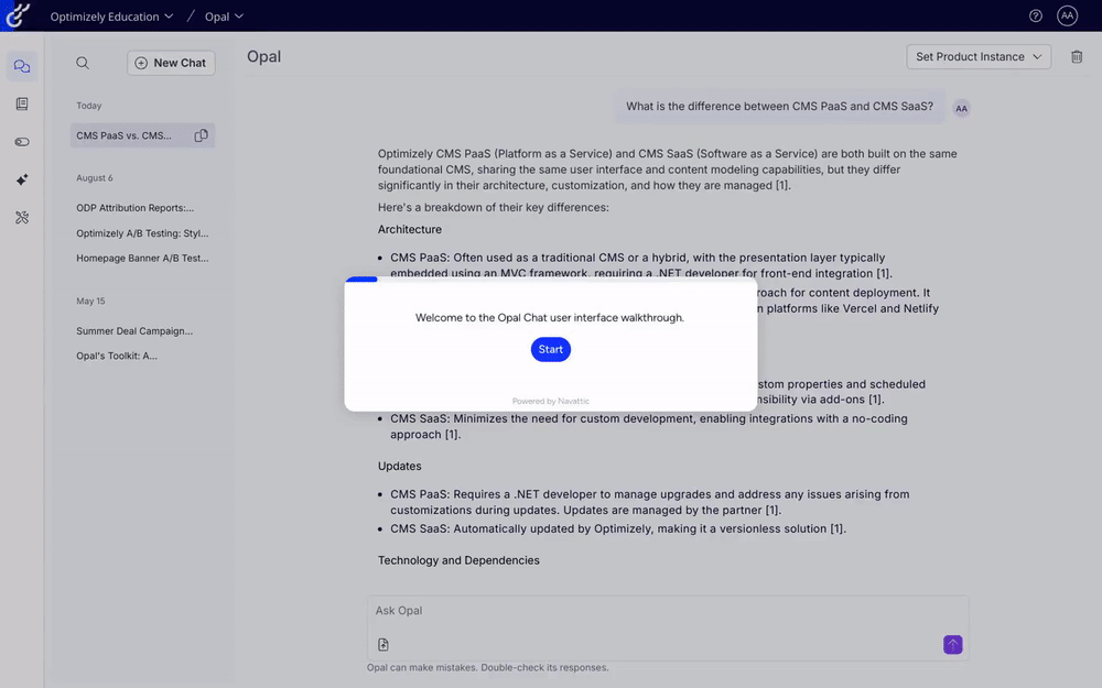 - Iterative refinement – Do not expect the perfect response on the first try. Prompt engineering is an iterative process. Start with a general prompt, then refine it based on Optimizely Opal's initial response. Experiment with different phrasings, keywords, and levels of detail to fine-tune the output.