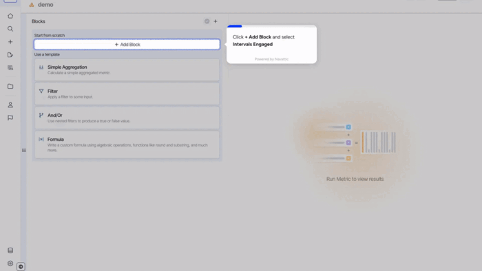 Intervals engaged block calculates the number of time intervals, such as days or weeks, during which a user or other actor interacted with a product or service. This block is useful for measuring user engagement with a product, feature, new release, or experiment.