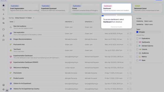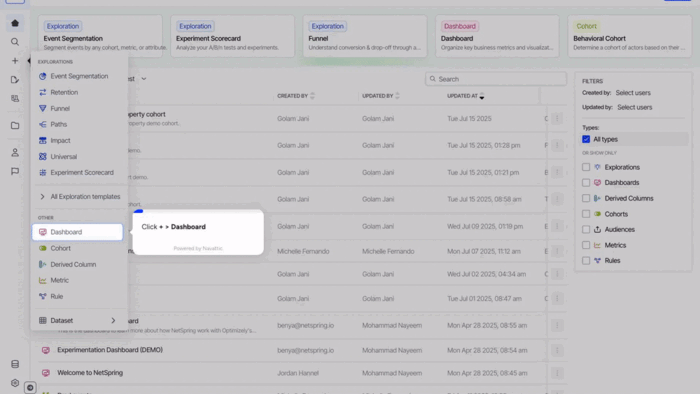To demonstrate how to use the Dashboard feature in Optimizely Analytics, this walkthrough will guide you through creating a dashboard focused on Product Engagement: